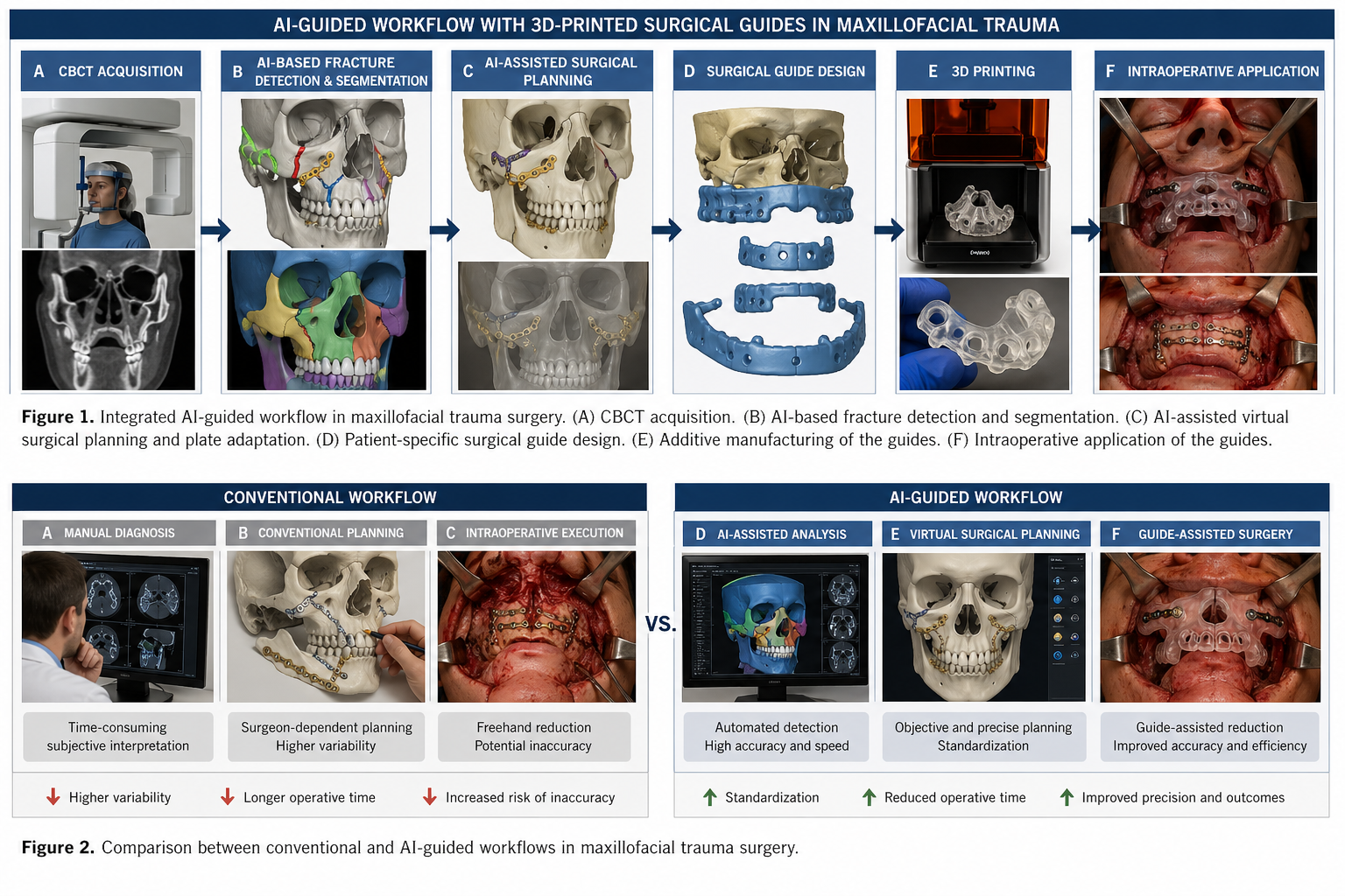 This prospective two-center clinical feasibility study evaluates the integration of AI-guided planning with patient-specific 3D-printed surgical guides to improve precision and efficiency in maxillofacial trauma surgery.