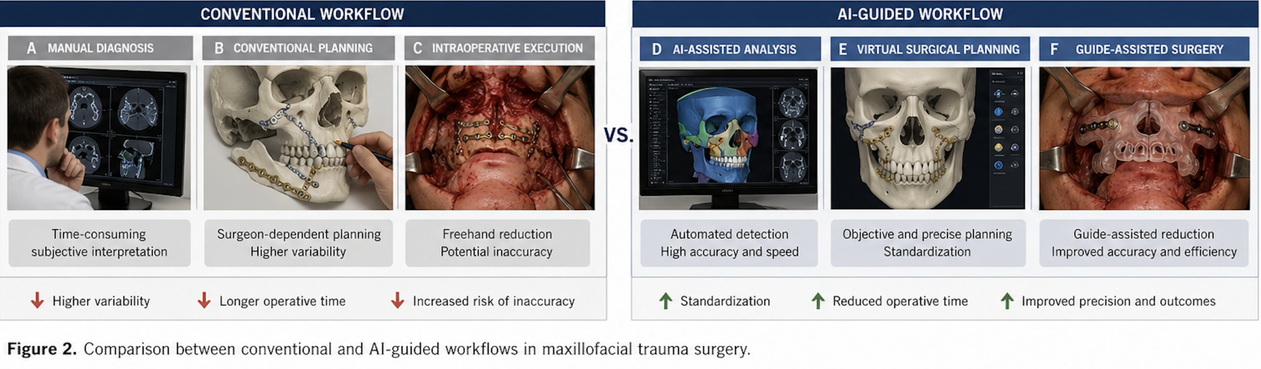Artificial intelligence (AI) and additive manufacturing have demonstrated high accuracy in fracture detection, surgical planning, and feasibility of clinical implementation in maxillofacial trauma. However, high-level evidence comparing AI-guided workflows with conventional surgical approaches remains limited.